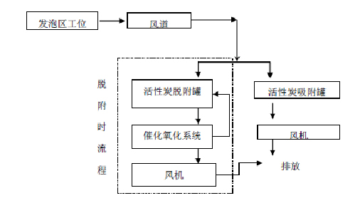 本項目采用“收集+預(yù)處理+活性炭吸附、脫附裝置處理+催化燃燒”主要包括以下兩個部分: 1)經(jīng)過預(yù)處理后的廢氣,經(jīng)活性炭吸附系統(tǒng)處理后通過排氣筒高空排放。 2)活性炭飽和后利用熱空氣進行脫附,脫附后氣體經(jīng)過催化氧化系統(tǒng)進行進一步處理凈化后排放。